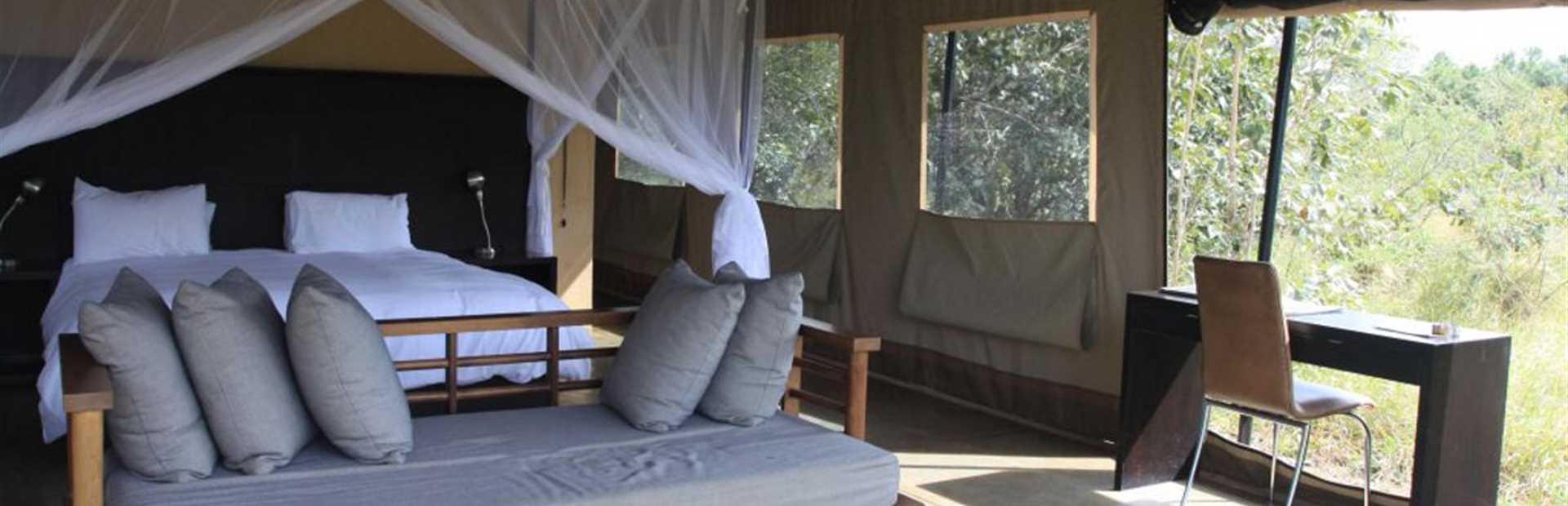 Honeyguide Khoka Moya has 12 large tents furnished in a contemporary yet comfortable style. Each tent is en suite with king-sized bed with a double shower and separate toilet. A private outdoor seating area in front of each tent allows guests to relax and take in the sights and sounds of the bush. The large tents at Khoka Moya measure some 60 sq km and can comfortably house a family of four, all under the protection of mosquito nets.